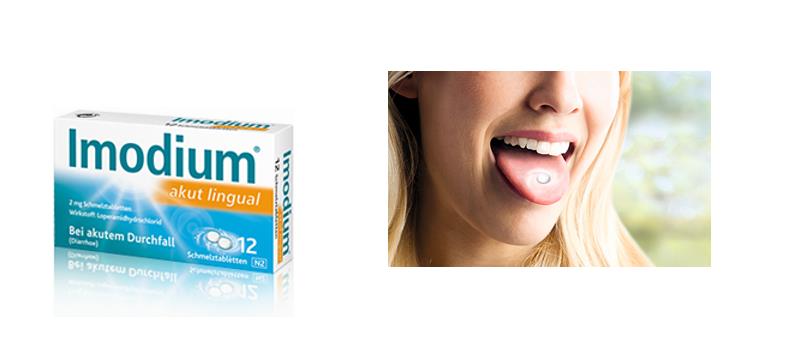 Wir empfehlen Ihnen IMODIUM® akut Lingual. Profitieren Sie von der Soforthilfe durch die schnelle und unkomplizierte Einnahme. Es handelt sich um eine Schmelztablette, die Sie einfach ohne Wasser auf der Zunge zergehen lassen können. Sie wirkt schnell und gezielt. Besonders beliebt für unterwegs.